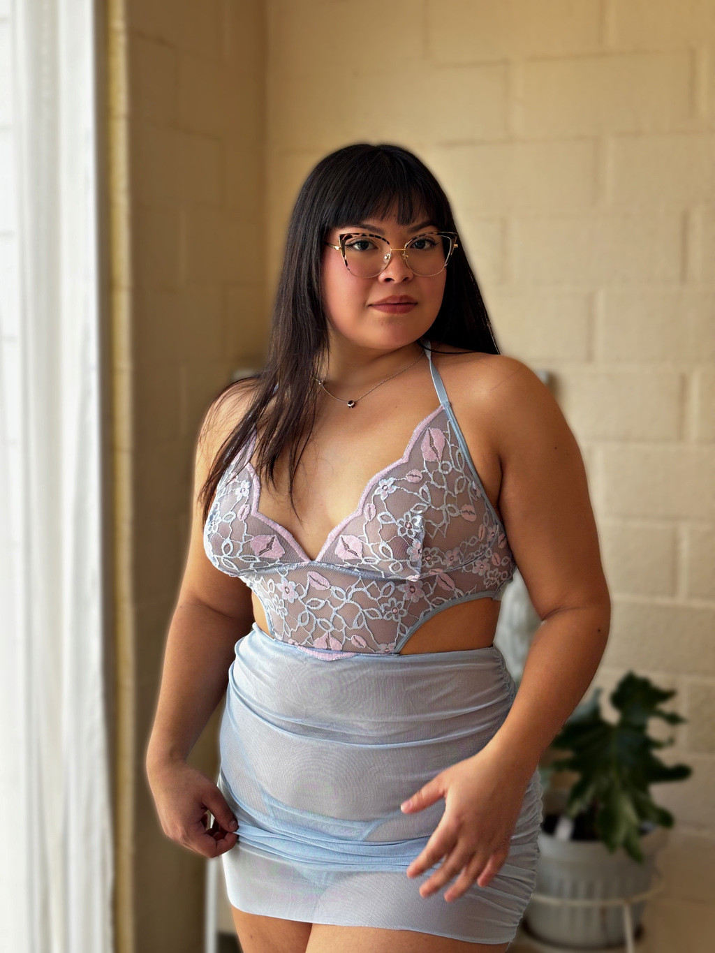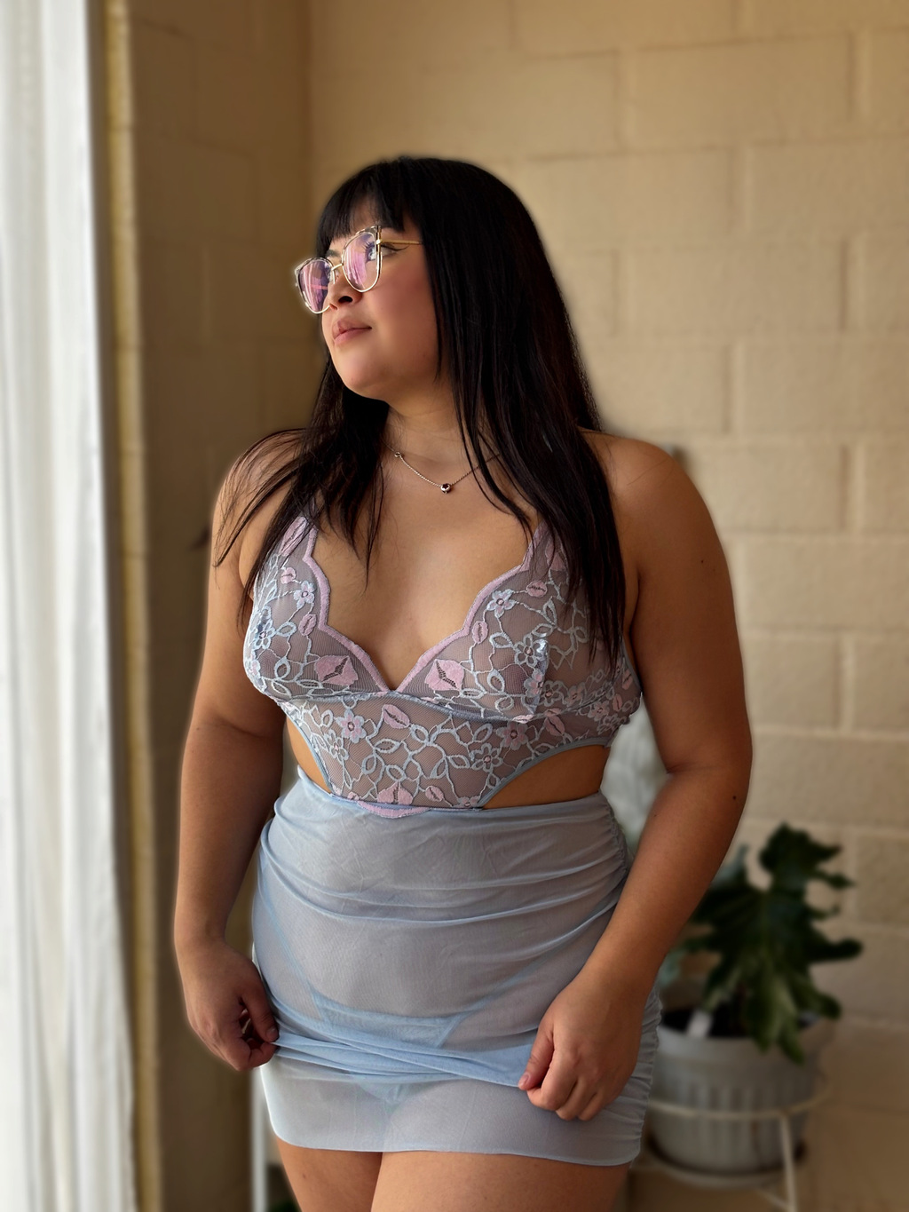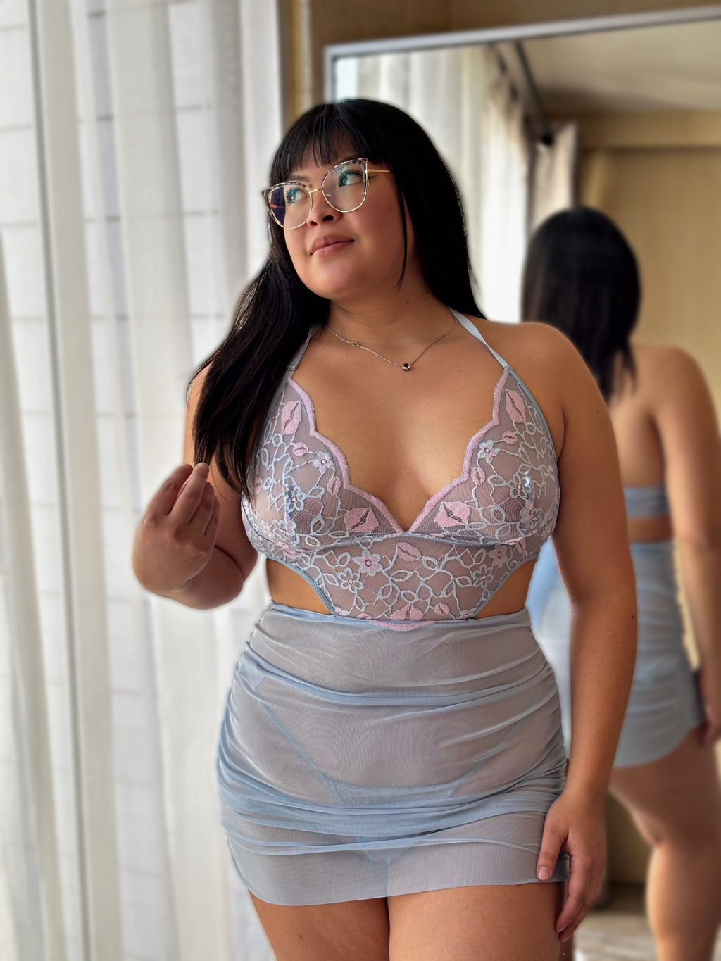 Delicado babydoll en tono celeste claro es sinónimo de sensualidad y elegancia. Diseñado con encaje fino en la zona del busto, resalta tu feminidad con un toque romántico. En la parte posterior, una cinta ajustable te permite formar un coqueto lazo que realza la silueta.